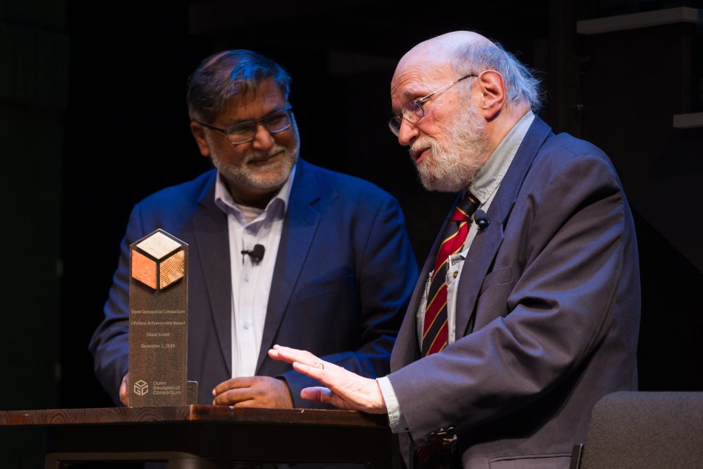 David’s long-standing friend and OGC Board Member, Velu Sinha, presented the award alongside a video message from Esri Founder & President, Jack Dangermond, who commented: “David recognized early on that the interconnection of the different disciplines, the different emerging technologies, the quantitative approaches, needed to be connected. This, he called interoperability. The interoperability of these emerging technology innovations into a kind of system of systems… So I’m very thankful, David. I want to personally acknowledge you for this work. For not just the idea, but the persistent working among the heterogenous groups around the world to drive these standards and this important concept home. Today, you see the results of that.”
