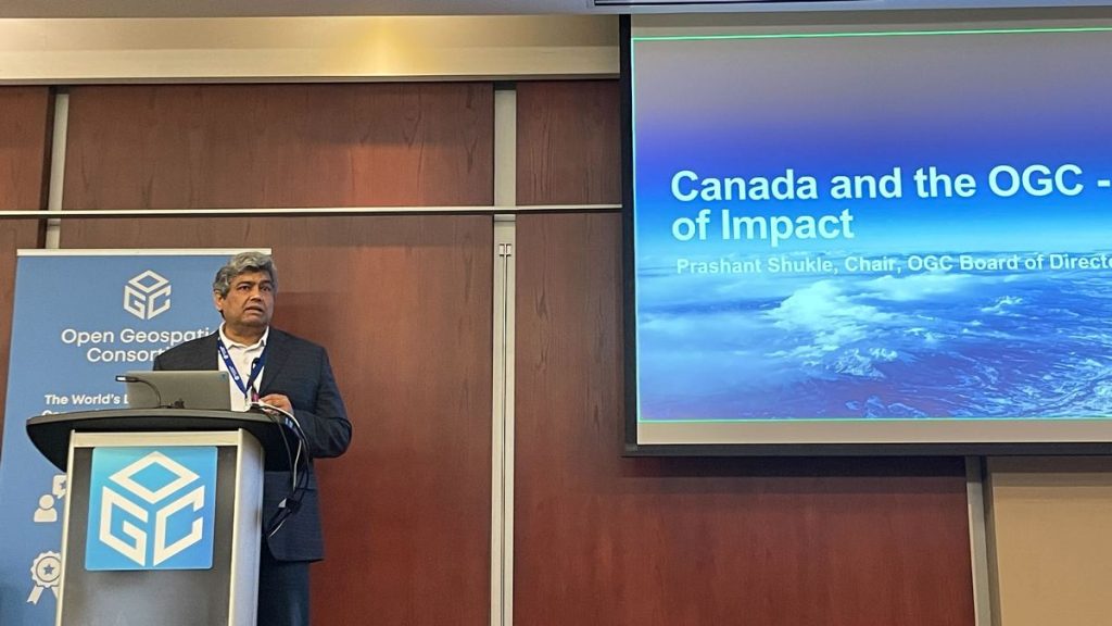 Introductory messages were then delivered by Louis-Martin Losier from Bentley Systems, Gordon Plunkett from Esri Canada, Hermann Brassard from CAE, and Dean Hintz from Safe Software. Finally, Prashant Shukle, Chair of the OGC Board of Directors, presented on “Canada and the OGC – 30 years of impact,” which reflected on the important parts that Canadian organizations have played in OGC’s 30 year history.