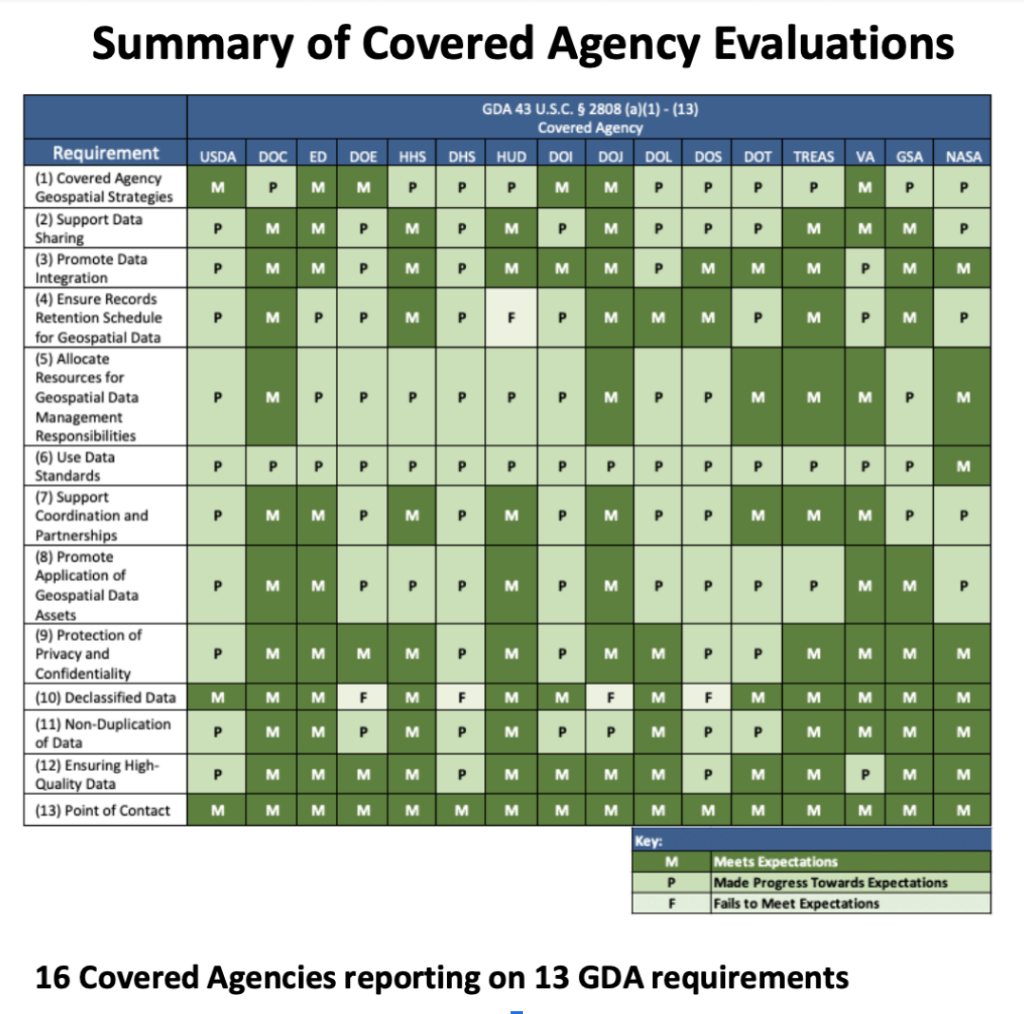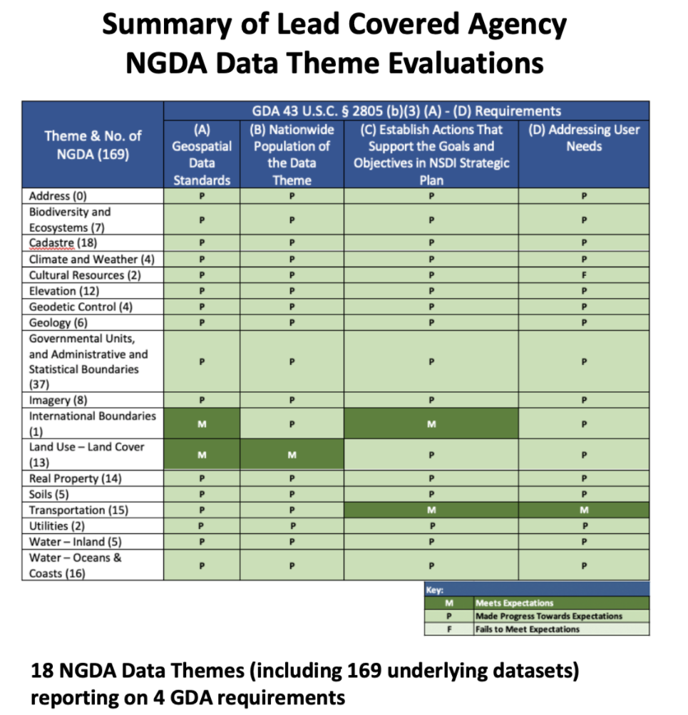 In April 2021, Federal GDA Lead and Covered Agencies provided the FGDC with their initial annual  NGDA Theme assessment reports as required by the GDA. These reports,  as well as a NGAC assessment of the GDA reporting process and approach, are available on the FGDC website. While a quick look at the online dashboard summarizing the state of compliance and the themes by agency indicates progress, the data raises a number of  questions as to the degree of compliance of each agency/theme.  We believe this uncertainty should prompt a discussion about the level of investment needed to fully meet the compliance criteria, but more importantly to reap the benefits of the GDA.